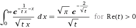 integral exp(-1/(x*t))*exp(-x)/sqrt(x*t)*dx from x=0 to x=infinity